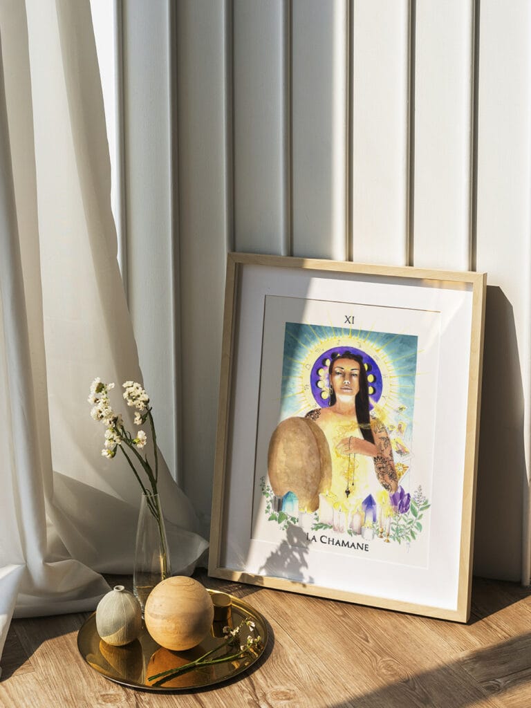 On m’a demandé de réaliser un portrait qui représente la personne, pas seulement à travers ses traits, mais aussi par la symbolique de différents éléments. À partir de mots-clés (ici lumineux, chamane, mystique…) et d’une description de sa personnalité, j’ai dessiné et peint (aquarelle + crayon de couleur + gouache) en grand format 29,7 x 42 cm (A3), cette Chamane !